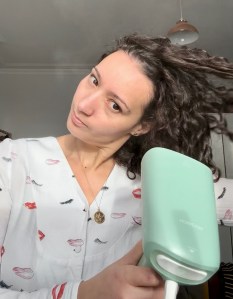 It’s another water one! If your curls are frizzy when you wake up, there are a few refresh methods that could help smooth the fluff. A steam refresh involves using steam (duh) to loosen wonky curls and reactivate the styler in your hair. Then, you can smooth or scrunch a tiny bit of leave-in or styler on top.