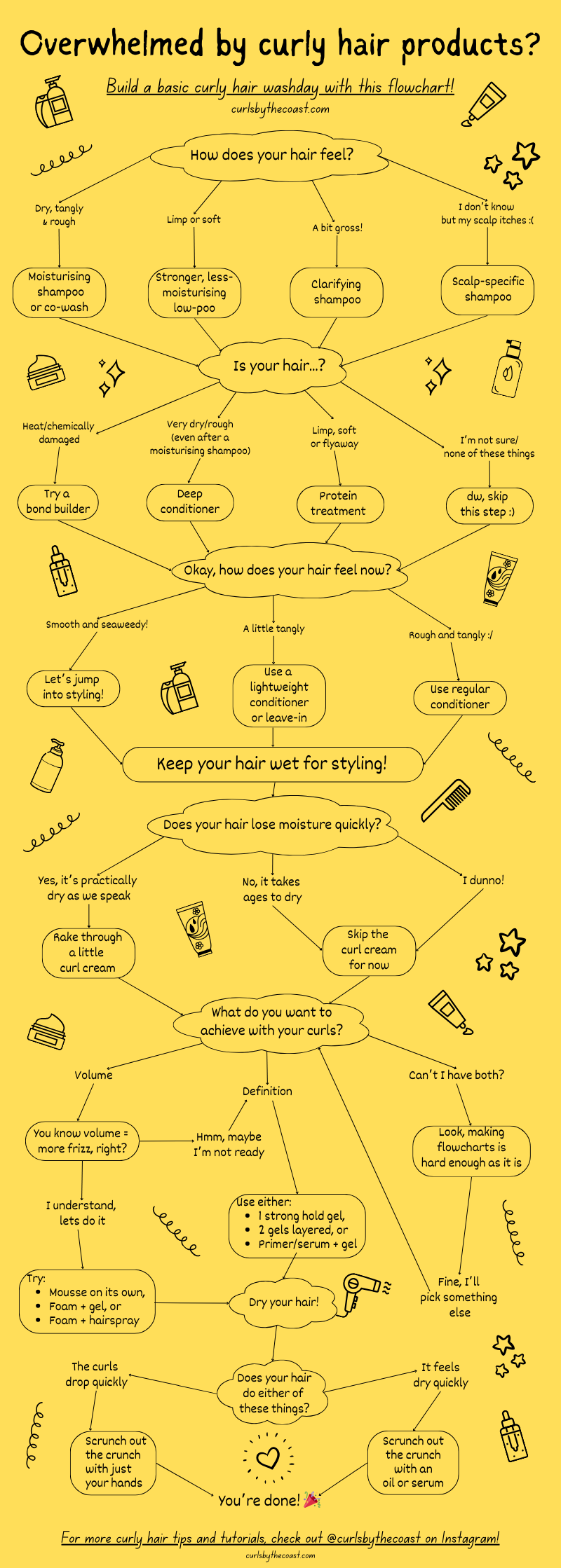 Well, I have attempted to make a flowchart to help you figure out what your hair needs! Simply follow the questions below and start building a basic curly hair washday. You’ll notice that I don’t ask what your curl pattern is – because it doesn’t really matter that much! And whether your hair is fine or coarse, the below questions are elements that all hair types need to take into account.